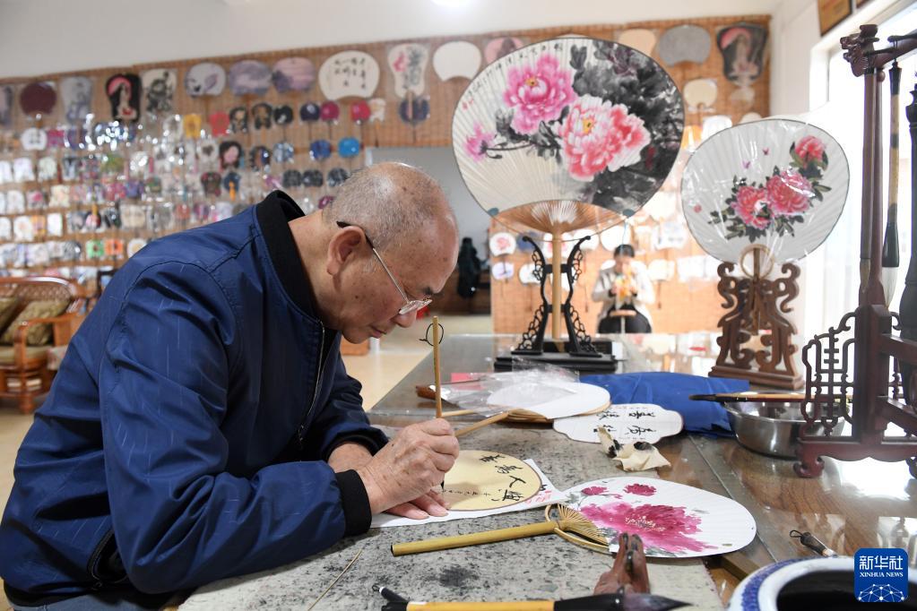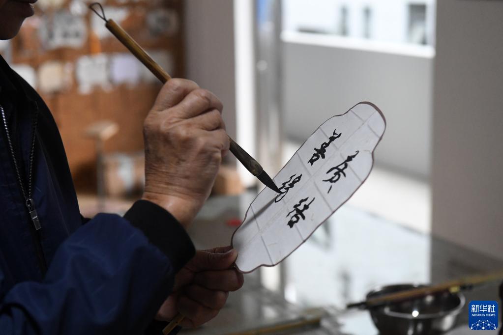 在广西桂林市灵川县定江镇,圆竹剖丝团扇制作技艺传承人黄硕夫在题写扇面(10月29日摄)。
