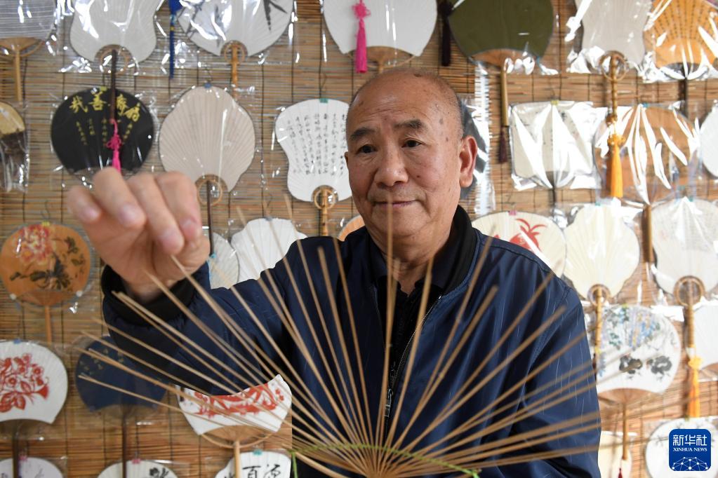 在广西桂林市灵川县定江镇,圆竹剖丝团扇制作技艺传承人黄硕夫在制作团扇(10月29日摄)。