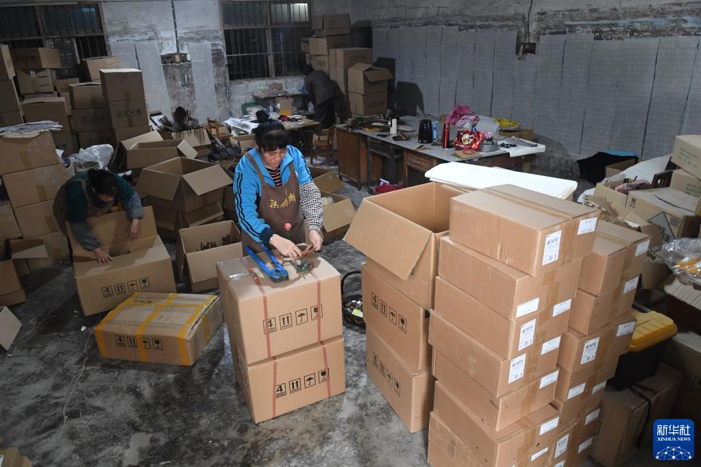 在广西桂林市灵川县定江镇一家文化创意企业,员工在包装圆竹剖丝团扇产品准备外销(10月29日摄)。
