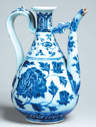 明青花缠枝牡丹纹执壶。上海博物馆供图