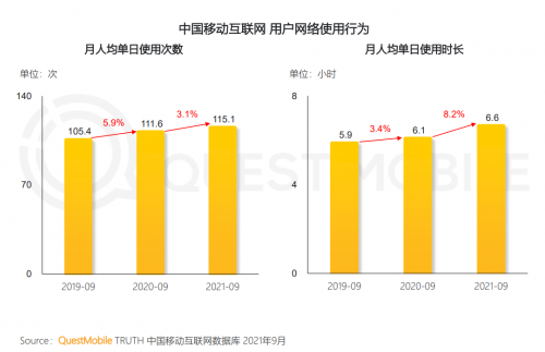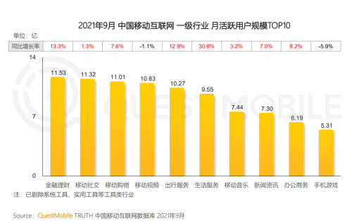 QuestMobile数据显示,截止2021年9月,中国移动互联网月活用户达到11.67亿,月人均单日使用次数和时长分别达到115.1次及6.6小时,持续加深了使用习惯,推高了生活数字化程度。从行业用户规模看,金融理财月活用户量11.53亿,移动社交11.32亿、移动购物11.01亿,成为用户渗透最深的三大领域,这背后,也预示着深度的变化正在发生。