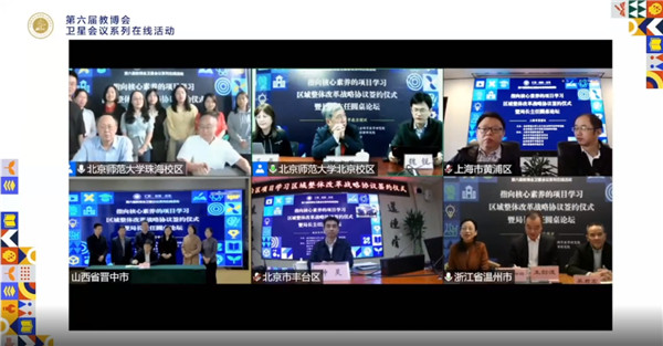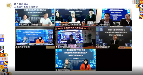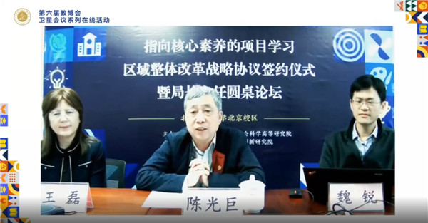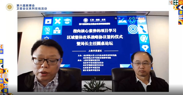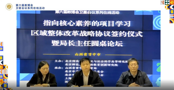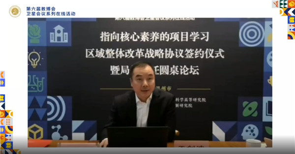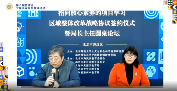 近日,教博会首期卫星会议系列在线活动之“指向核心素养的项目学习区域整体改革战略协议签约仪式暨局长主任圆桌论坛”圆满举办。教育部基础教育教学指导委员会副主任、北师大中国教育创新研究院学术委员会主任、项目学习总项目组主任张卓玉,北京师范大学专家偕同各试验区教育部门负责人出席论坛,从教育发展趋势和学科教学两个层面探讨了开展项目学习的目的、意义及推广方法。北师大中国教育创新研究院副院长魏锐教授担任本场论坛的主持人。