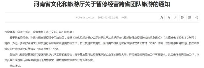 通知指出,鉴于洛阳市、许昌市已出现疫情中风险地区,为进一步做好全省文化和旅游行业新冠肺炎疫情防控工作,防止疫情扩散蔓延,各地要严格执行跨省旅游经营活动管理“熔断”机制,立即暂停旅行社及在线旅游企业经营跨省团队旅游及“机票+酒店”业务。