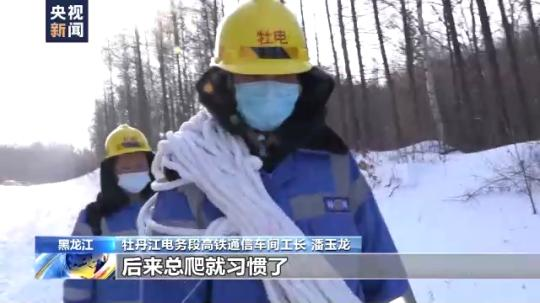 牡丹江电务段高铁通信车间工长 潘玉龙:腿稍微有点麻。今天上面风有点大,上面直晃悠,跟坐船似的。刚开始也害怕,后来总爬就习惯了。