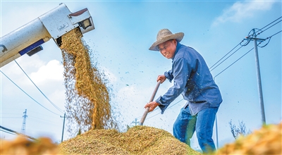 10月8日,在安徽省芜湖市繁昌区峨山镇城东村,农民在收获水稻。 |