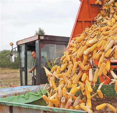 10月7日,在山东省枣庄市市中区孟庄镇焦庄村,农民将收获的玉米装车。 |