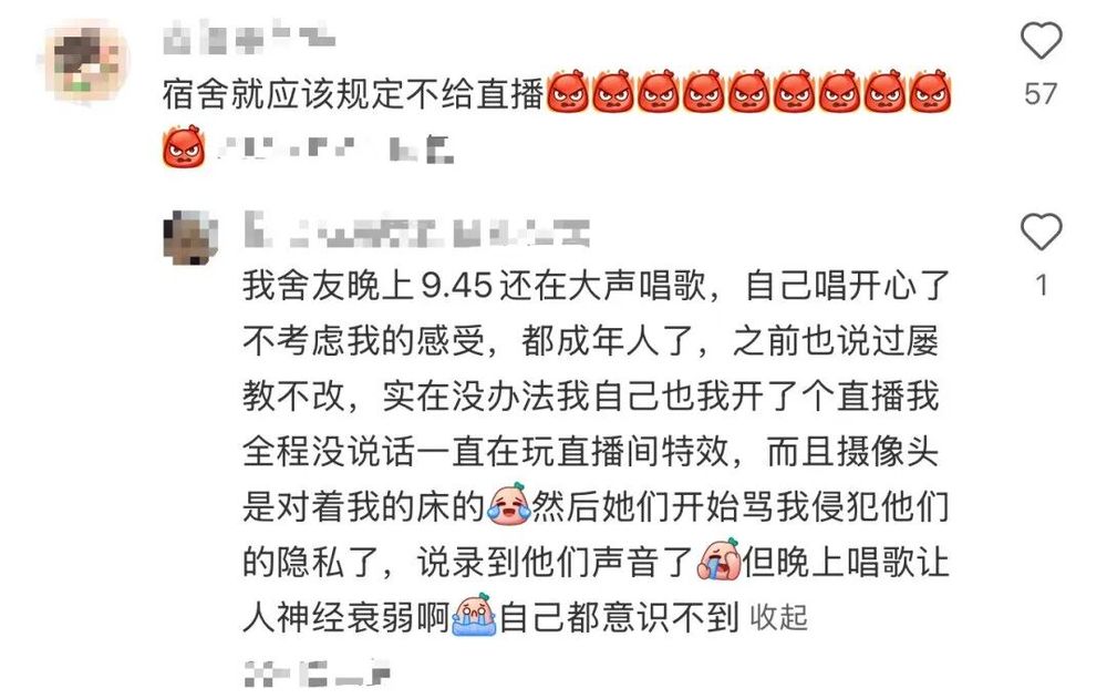 面对“直播”这一新鲜事物,大学宿舍管理也呈现出一定的滞后性。多数高校的校规与宿管条例中,并未明确禁止或规范直播行为,使得宿舍直播长期处于管理的“灰色地带”。而当其他学生因室友直播受到困扰时,又常常面临投诉无门的困境,最终只能通过社交媒体发帖吐槽,或是演化成为宿舍内部的矛盾和摩擦。