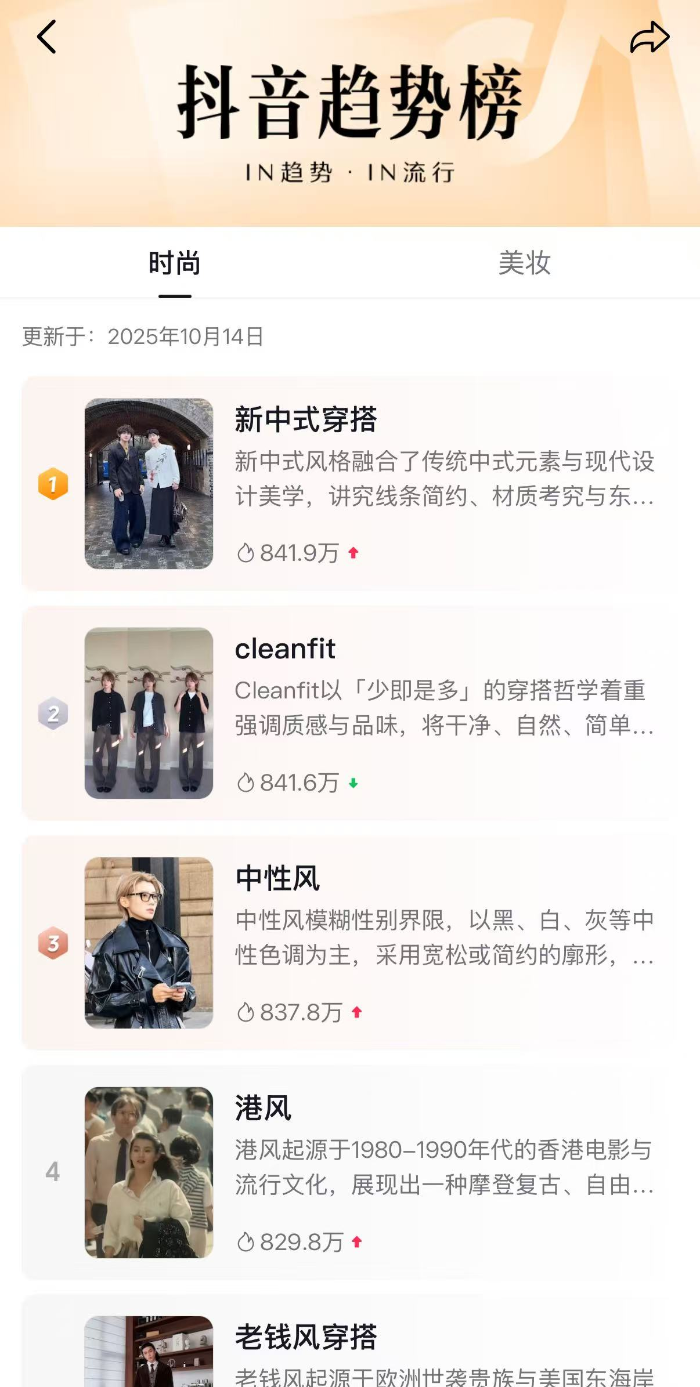 10月13日,抖音举办“时尚新生·在此刻发生”2026春夏·抖音趋势大秀及抖音趋势发布会,并正式发布“抖音趋势榜”。该榜单基于平台近7日的播放、互动、搜索及电商数据生成,帮助网友实时捕捉最新时尚风向。可以在抖音搜索“抖音趋势榜”,或者点击顶部搜索框,找到趋势榜入口。
