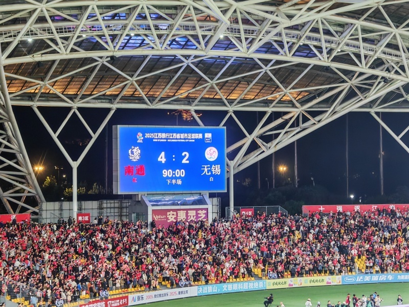 下半场易边再战,双方都积极进行了调兵遣将,但无奈都未能攻破对方球门。鏖战90分钟,双方战平,进入点球大战。最终南通队以4:2击败无锡队,成为第二支进入“苏超”决赛的队伍。