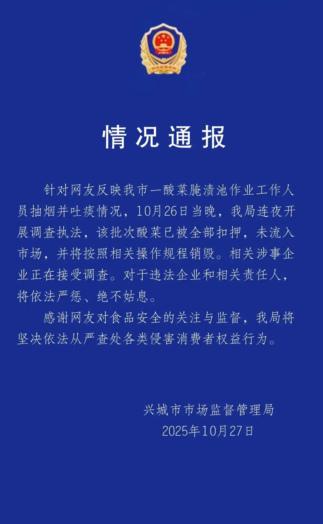 10月26日,一位网民在社交平台发布视频称,辽宁省葫芦岛市兴城市一酸菜企业的生产制作环境恶劣,有工人作业时抽烟吐痰。视频画面显示,一男子站在酸菜池中用钢叉将酸菜翻动并铲至一旁,另一男子在工作过程中全程抽烟,并在酸菜池中吐痰。这段视频迅速传播并获得大量关注,网民对此表示震惊与愤慨,讽刺称“这是真正的‘老痰’酸菜”。