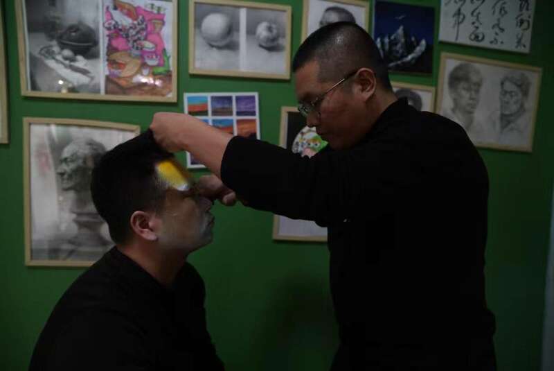 每次演出前,李晓涛要“择脸”,决定哪张脸化哪个妆,脸大的演员有优势,承得下更复杂更多细节的妆容;额头高的人可以画上半张脸细节更多的“三块瓦”。画着同一底色的演员表演时不能站在一起,以免观众有重复的感觉。