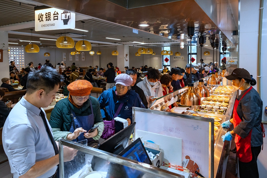 2025年11月18日,游客们在四川博物院食堂内排队选菜。新华网 张可凡 摄