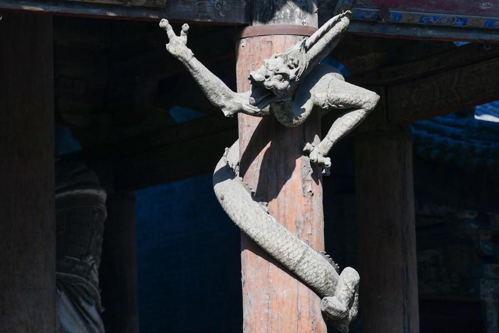 这是12月9日在山西省太原市晋祠拍摄的木雕盘龙,因其造型独特被网友亲切地称为“比耶龙”。