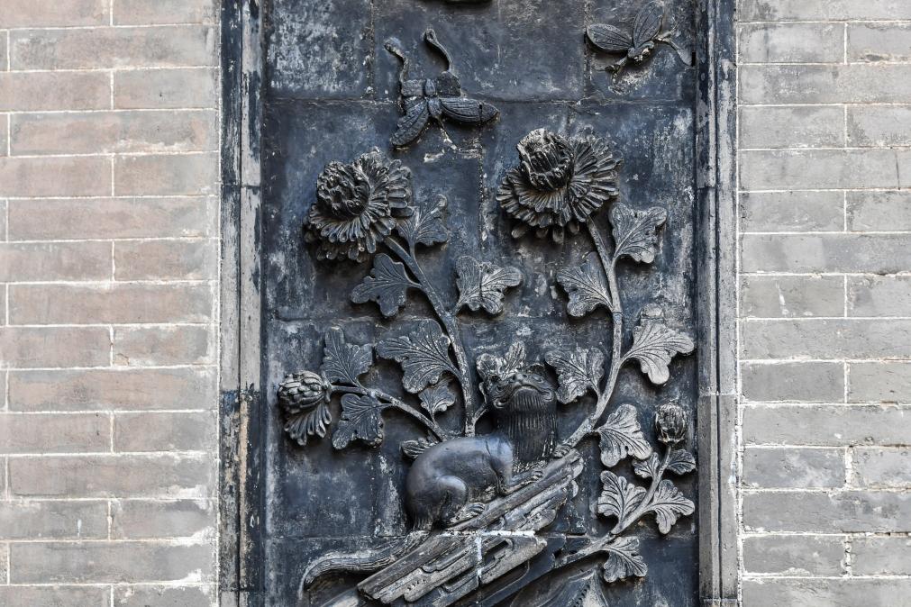 这是12月11日在山西省祁县乔家大院拍摄的猫与蝶为主题的砖雕。