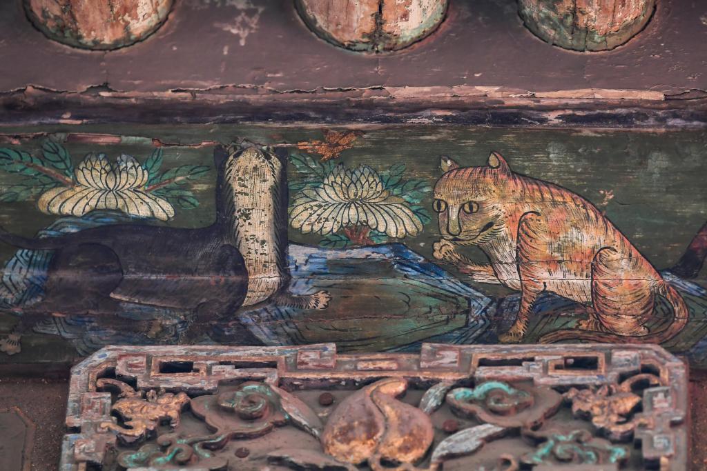 这是12月11日在山西省祁县乔家大院拍摄的猫与蝶为主题的外檐彩画。
