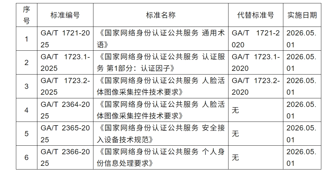 《国家网络身份认证公共服务管理办法》已于2025年5月23日发布,并于7月15日实施。为支撑法规的落地与实施,近日公安部发布了2025年第2号《中华人民共和国公安部公共安全行业标准公告》,国家网络身份认证公共服务标准体系中6项公共安全行业标准正式发布,于2026年5月1日实施。标准具体内容如下: