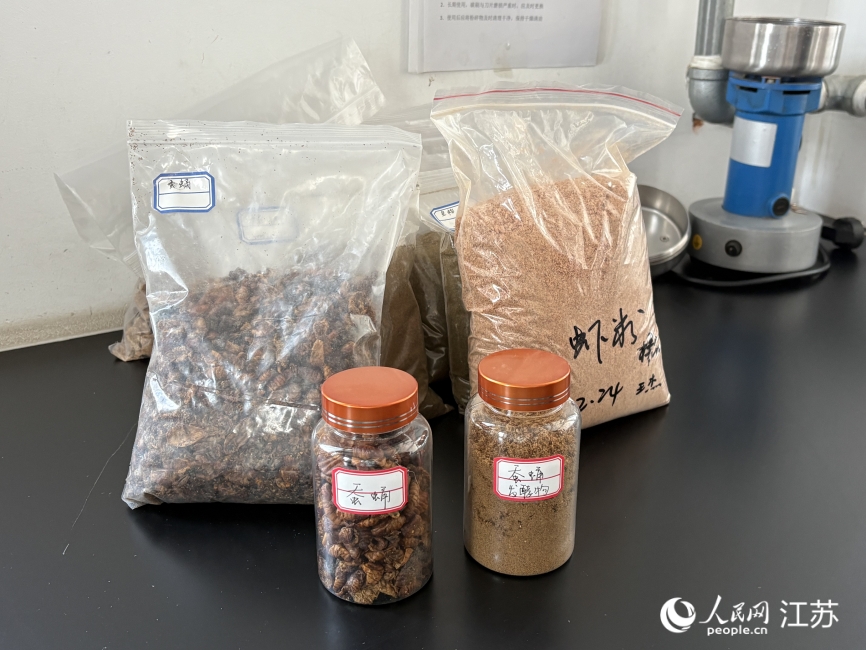 连云港韩德饲料有限公司生产的蚕蛹粉样品。人民网 刘益佳摄