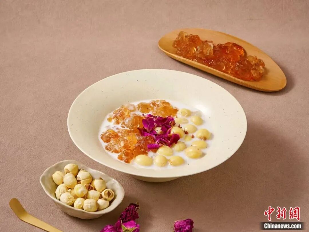 桃胶莲子炖鲜奶。安国市官方供图