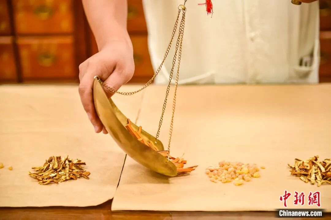 工作人员正在称量药材。安国市官方供图