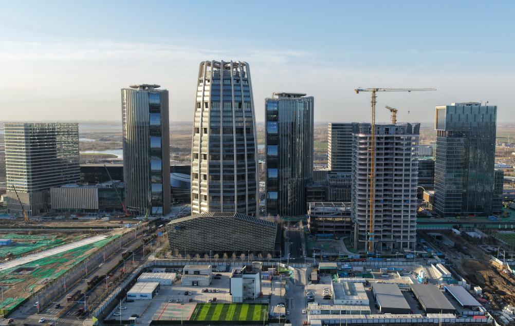 在雄安国贸中心项目施工现场,机械轰鸣、焊花闪烁,工人们正紧张有序地忙碌着。这一项目集轨道交通、航空服务、办公、商业、酒店等功能于一体,既是雄安城市地标,也将成为京雄同城化重要交通节点。目前,这里9栋单体建筑全面封顶,进入室内精装和机电安装阶段。