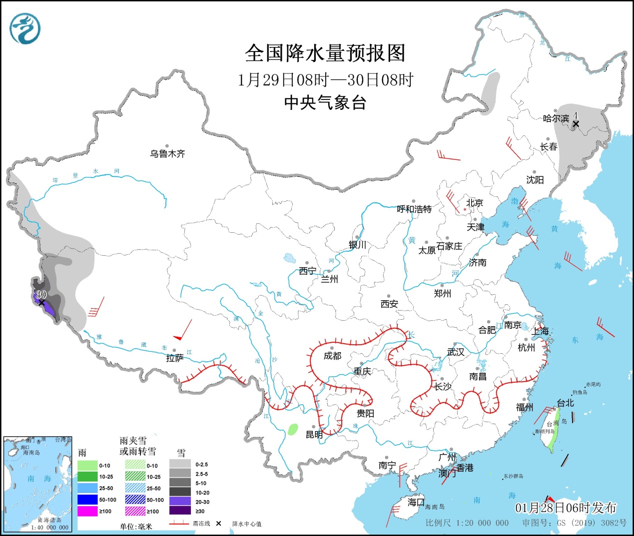 全国降水量预报图(1月28日08时-29日08时)。图片来源:中央气象台网站
