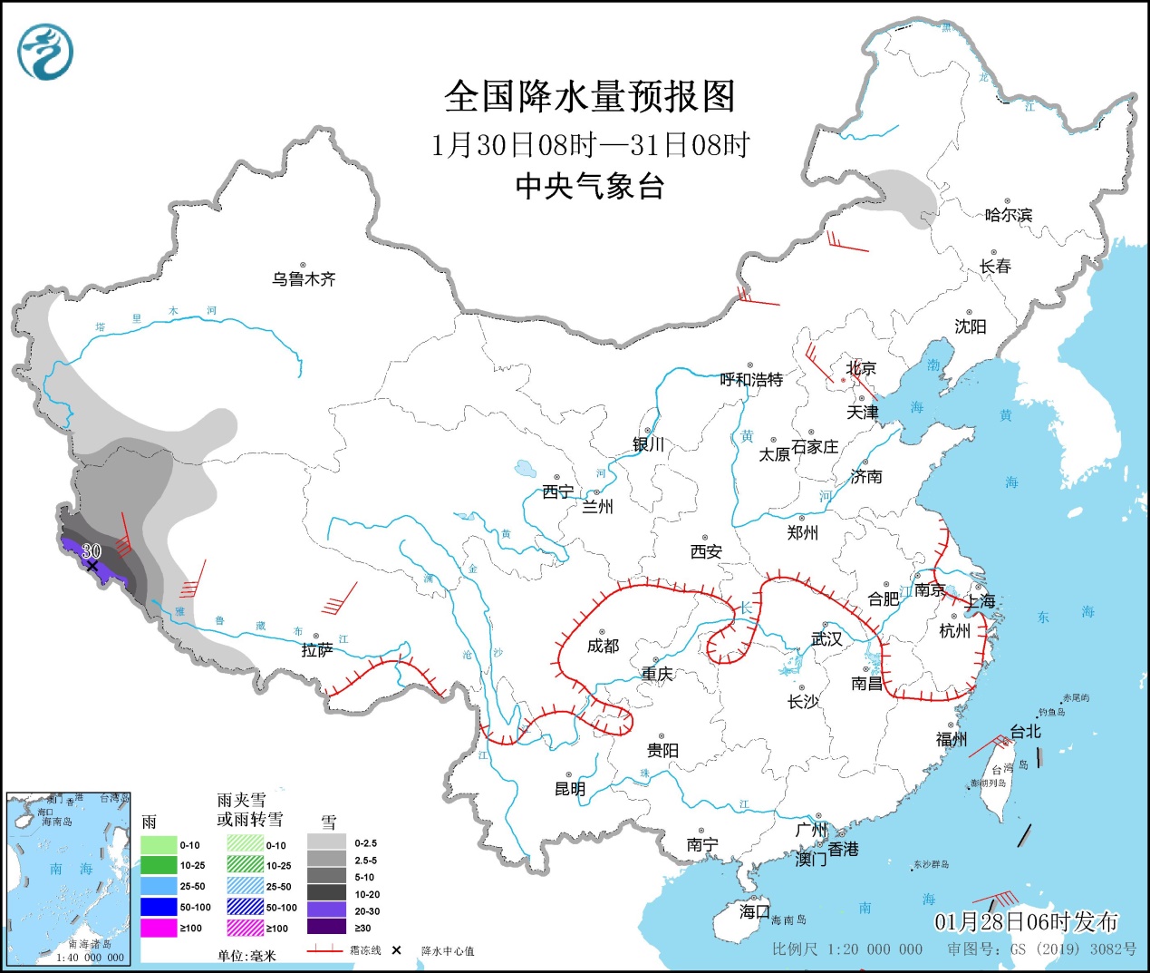 1月30日08时至31日08时,新疆西南部山区、西藏西部有小到中雪,其中西藏西部的部分地区有大到暴雪,局地大暴雪(20~30毫米)。内蒙古中部、华北北部等地的部分地区有4~6级风,西藏中南部的部分地区风力可达7级以上(见图3)。台湾海峡有5~7级、阵风8级的东北风,南海东北部和中东部和西南部海域有6~7级、阵风8级的偏东到东北风。