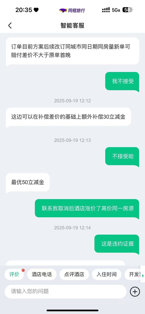黄女士介绍,在此期间,同程旅行平台曾联系自己,提出如果她重新预订同城市、同日期、同房型的新订单,平台可承担部分差价,但赔付金额不超过原单首晚房费(160元),并额外提供“50元立减金”。然而黄女士发现,此时当地同类房型房价已涨至四五百元。“这些补偿也不够弥补我的损失。”黄女士说。