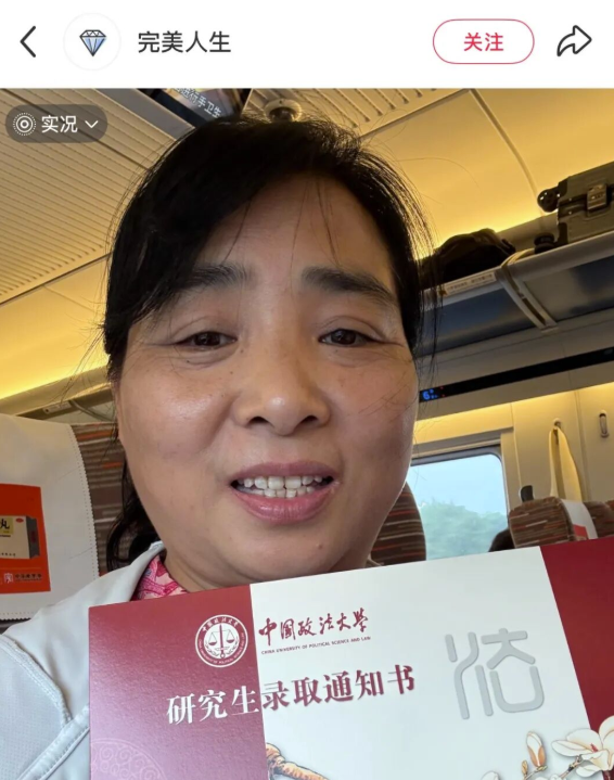 8月30日,社交平台上流传着一则“54岁河南阿姨考上中国政法大学研究生”的励志帖文。该网民账号名为“美丽人生”,称自己用了30年时间,从河南的县城考到北京的高校,现在在去北京西站的火车上,帖文所配照片为一名中年女性与一张“中国政法大学研究生录取通知书”的合影。帖文内容引发关注,获部分网民称赞“励志”。9月1日,该网民在另一篇帖子中回应“大龄研究生无意义”等质疑,称“退休后时间很充裕”“只要活着,任何时候做任何事都不为晚”,再次引发众多网民留言支持。9月3日上午,中国政法大学党委宣传部向澎湃新闻回应表示,该校已录取的2025级硕士新生中,“没有50岁以上的、河南籍的学生”,网民直呼“又是一起编造的‘励志’骗局”。另据媒体消息,该账号IP属地显示为北京,粉丝1907人,获赞与收藏高达18.8万。目前该账号被禁言,内容已清空。