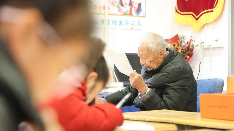 3月7日,99岁安徽和县卜陈学校退休教师叶连平,在和县乌江镇卜陈未成年人之家,他为6名学生义务辅导。刘琴/摄