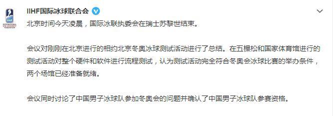 国际冰联:确认中国男子冰球队北京冬奥参赛资格