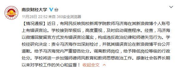 南京财大:教师冯济海发布错误言论属实 调离教师岗位