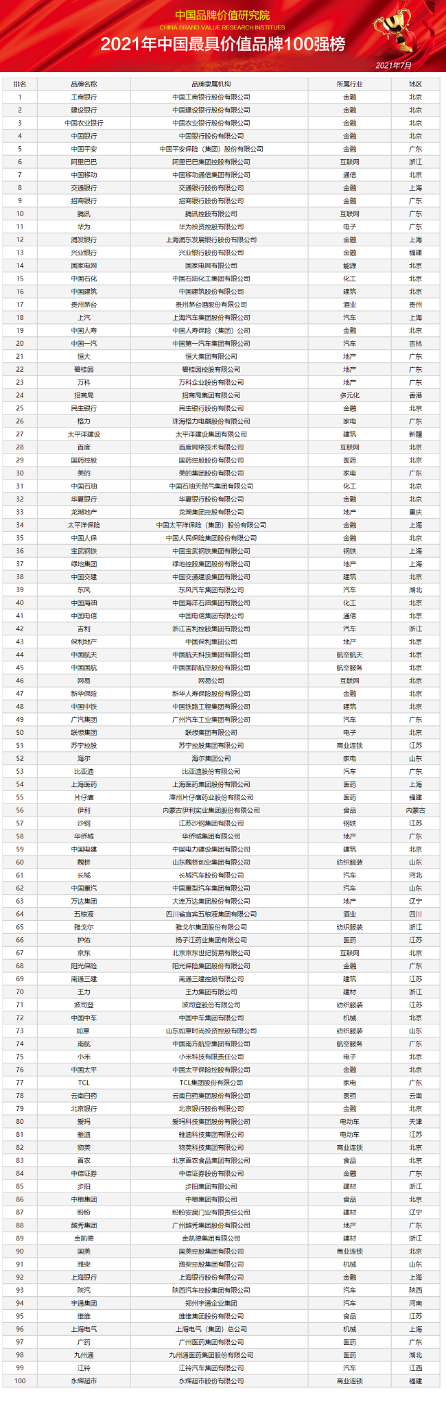 《2021年中国最具价值品牌100强》榜单隆重发布