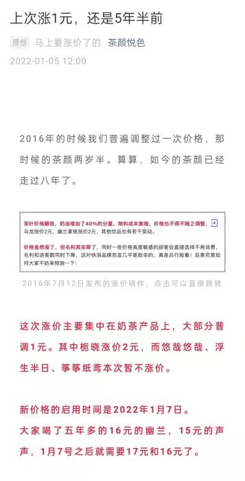 茶颜悦色时隔5年涨价 大部分奶茶产品涨1元