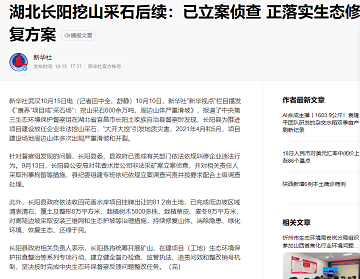 湖北长阳挖山采石后续:已立案侦查 正落实生态修复方案