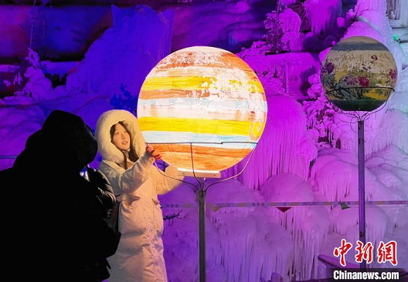 青海湟源:非遗排灯映衬七彩冰瀑 吸引游客观光