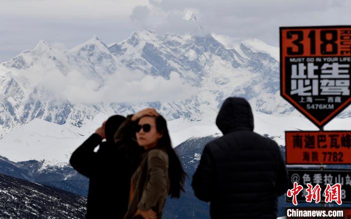 游客打卡西藏林芝色季拉山 赏南迦巴瓦峰