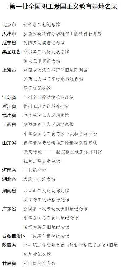 全国总工会命名首批27个全国职工爱国主义教育基地