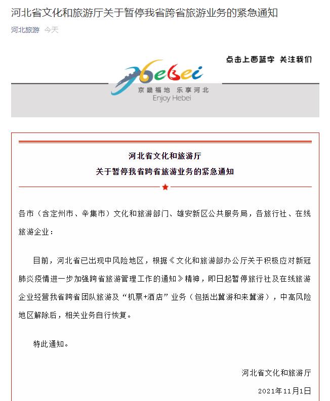 河北:即日起暂停跨省团队旅游及“机票+酒店”业务