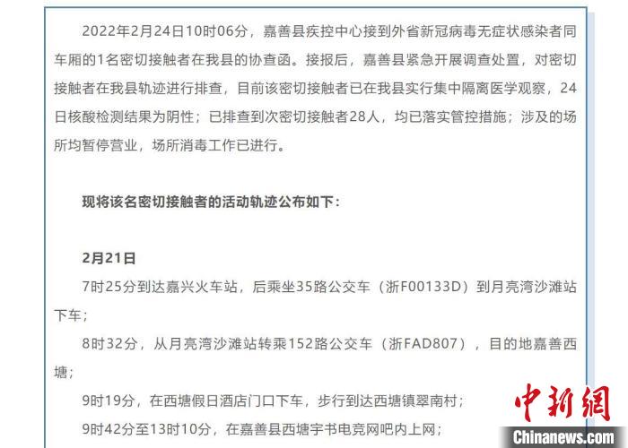 浙江嘉善发布1名密接者行动轨迹